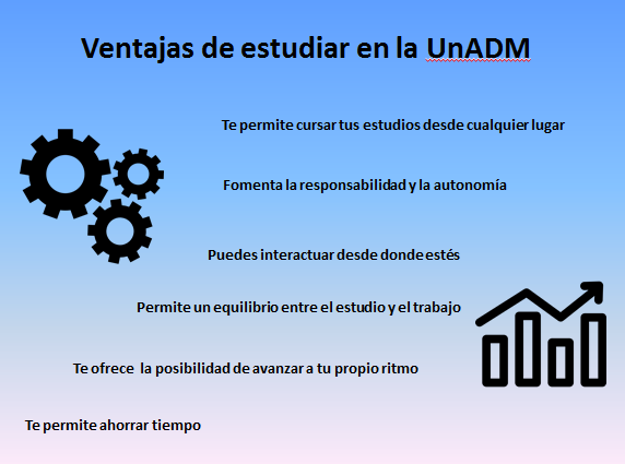 Misión de la UnADM: Formar profesionales del más alto nivel y en diversas áreas del conocimiento; éticos y con un sólido compromiso social hacia su comunidad; competitivos nacional e internacionalmente; con espíritu emprendedor y los conocimientos para que respondan a los avances de la ciencia y la tecnología, así como a las necesidades de desarrollo económico, político, social y cultural del país.